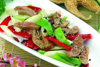 原料:肥鹅肝200克,京葱250克,青红椒50克,熟芝麻1克。